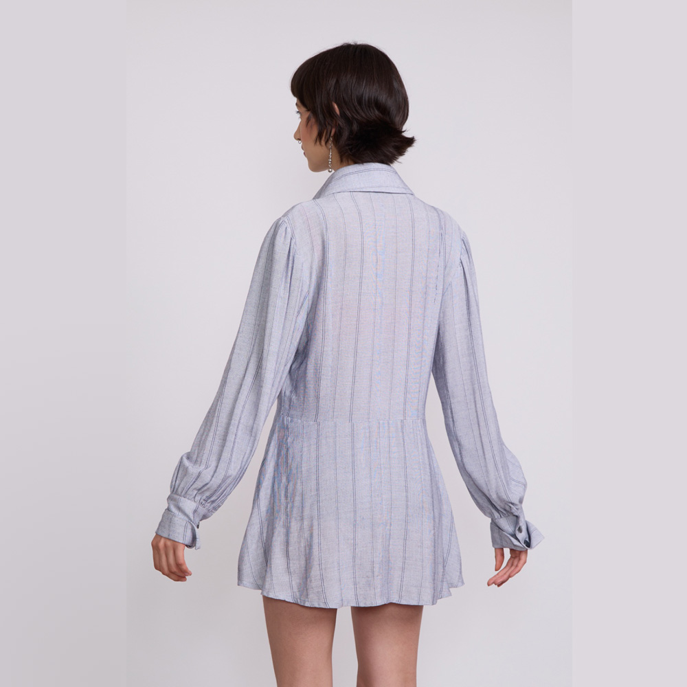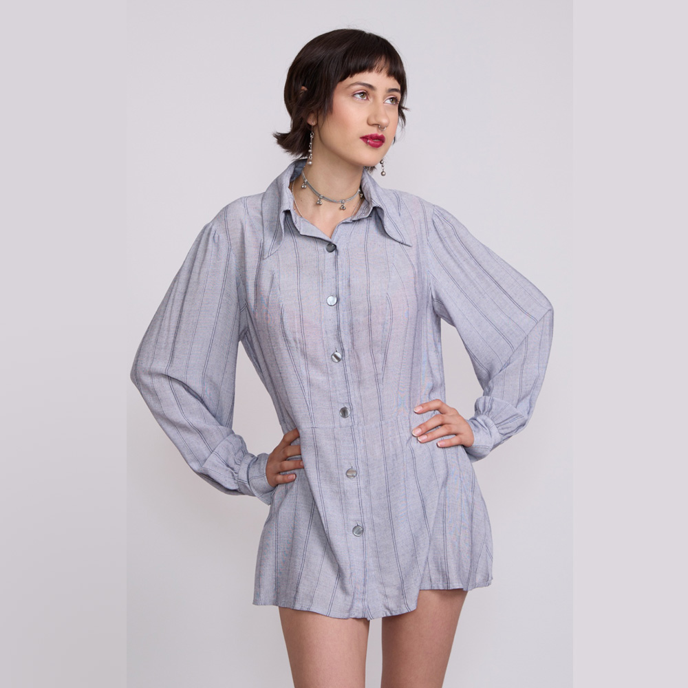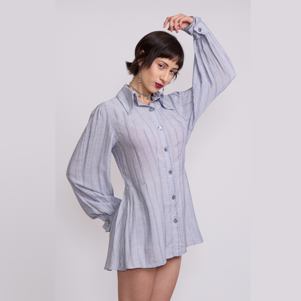 Su silueta estiliza la figura, acentuando la cintura y aportando movimiento en la zona de las caderas. El diseño combina modernidad y guiños a la moda retro de los años 70, reflejados en su cuello camisero amplio y en las mangas aglobadas a la altura de los antepuños, elementos característicos de esa década.