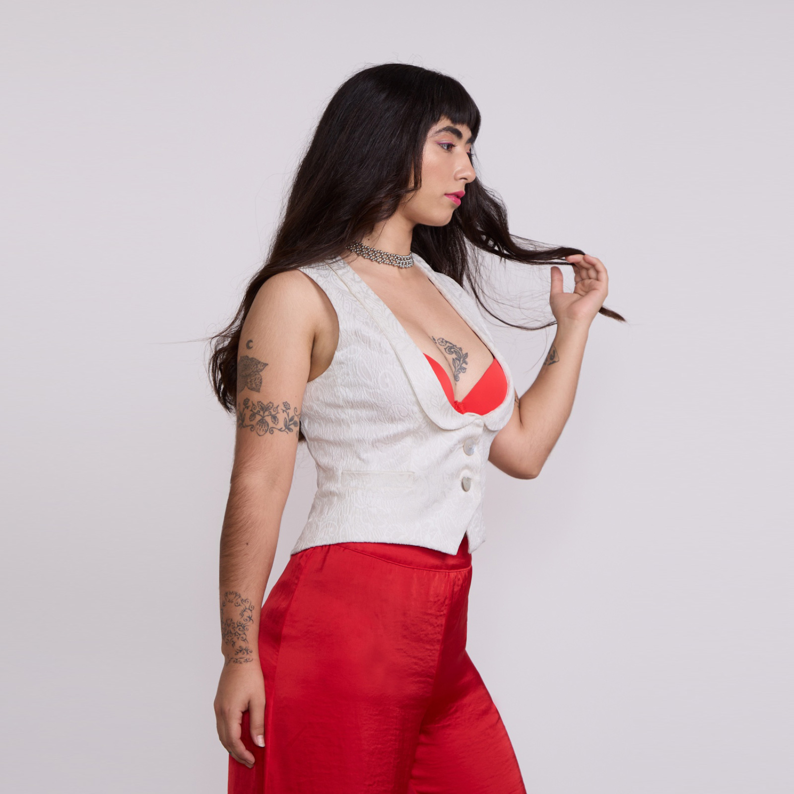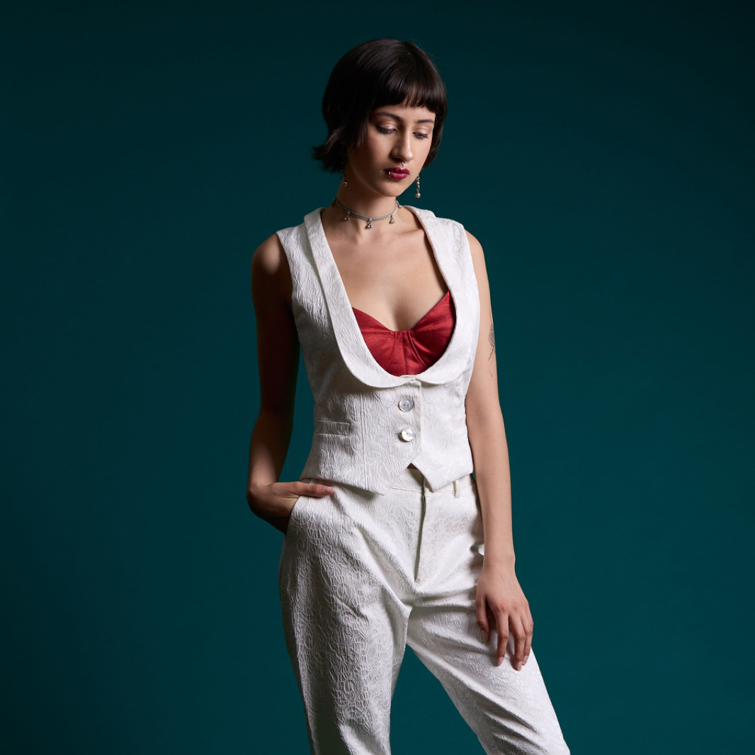 Confeccionado en brocato blanco y forrado en su interior, lo que aporta una sensación suave y cómoda sobre la piel. Su diseño retro-moderno, inspirado en la elegancia de los años 20, combina sofisticación y carácter. Una prenda versátil, ideal tanto para eventos importantes como para elevar un look de trabajo, con finos detalles de sastrería que realzan su estructura y estilo.