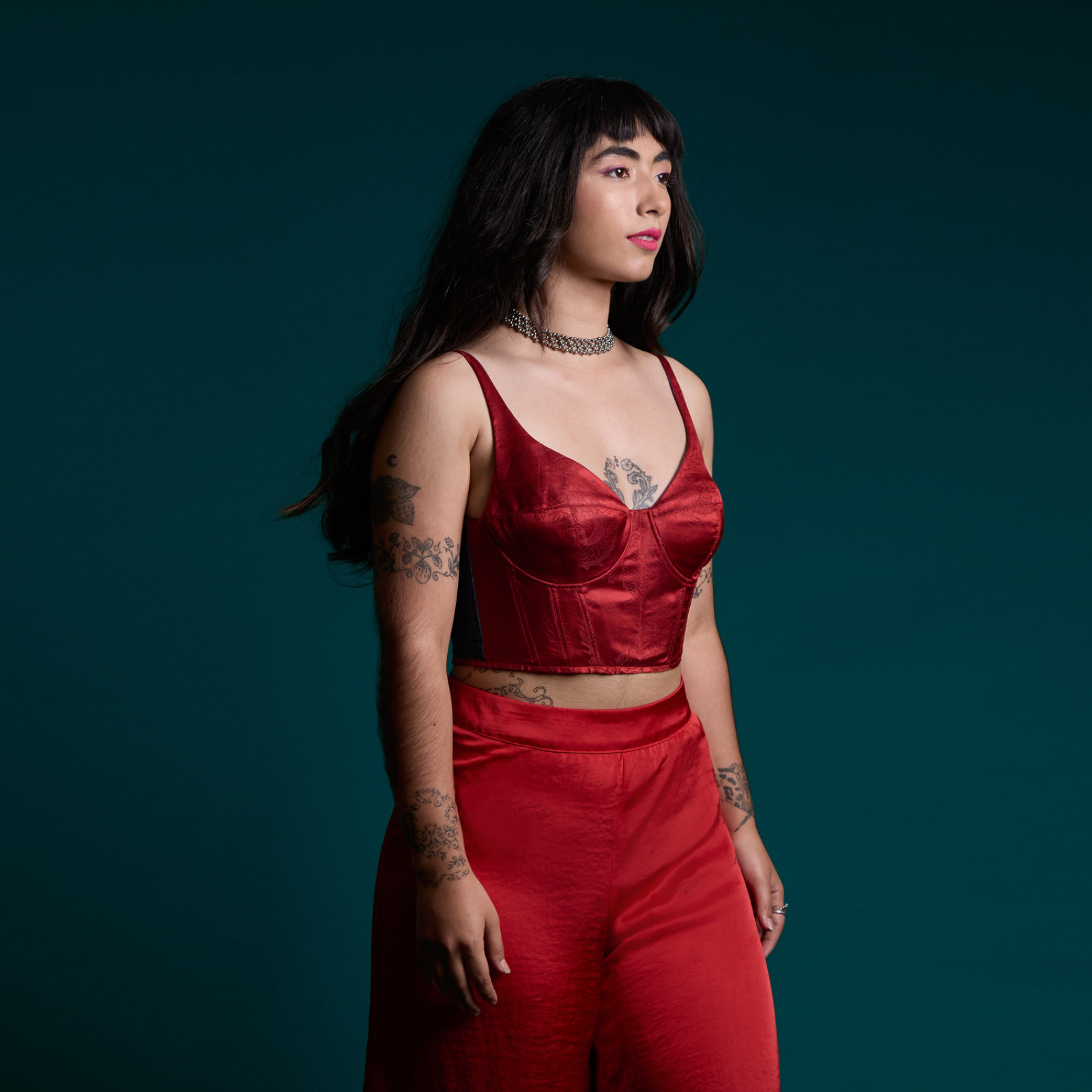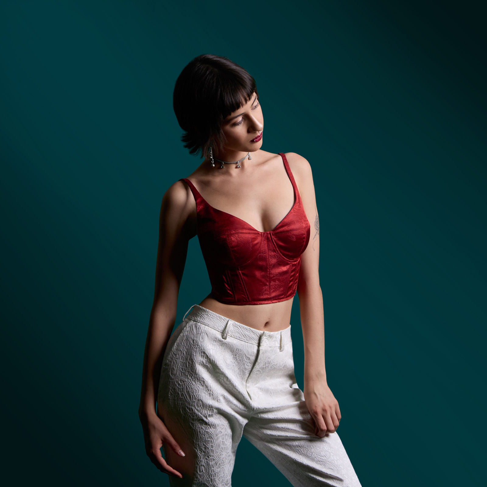 Confeccionado en acetato rojo estampado, con un forro interior de diseño Strobel Linnings que aporta mayor comodidad. Su tela es suave al tacto y agradable para la piel. Presenta una silueta estructurada que se ajusta perfectamente al cuerpo gracias a las barbas en el contorno y los tirantes regulables en la espalda. Un diseño moderno y elegante, ideal para ocasiones especiales o salidas nocturnas.