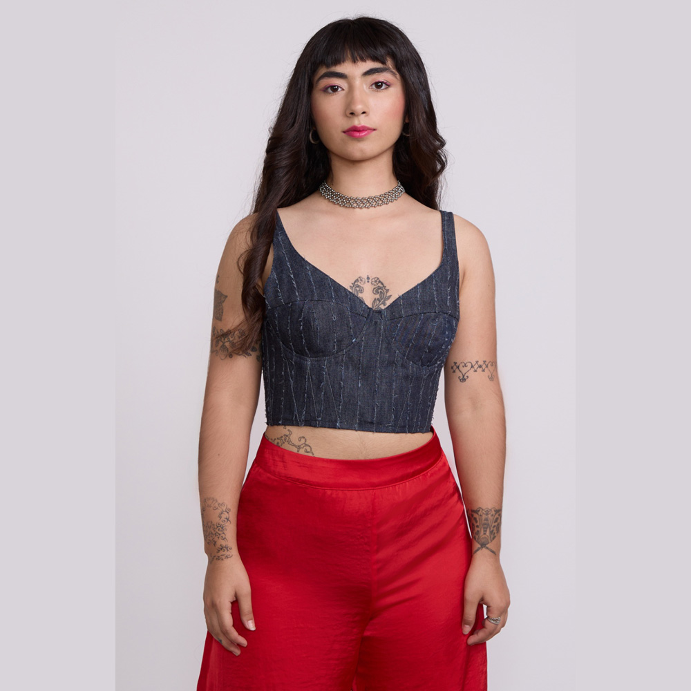 Confeccionado en denim de textura sutilmente desgastada y forrado interiormente con diseño Strobel Linnings. Su tela es suave y cómoda para la piel. Este diseño moderno y femenino se ajusta perfectamente al cuerpo gracias a sus barbas estructurales en el contorno y tirantes regulables en la espalda, que realzan la silueta con delicadeza. Ideal para looks cotidianos o para estilismos nocturnos con carácter.